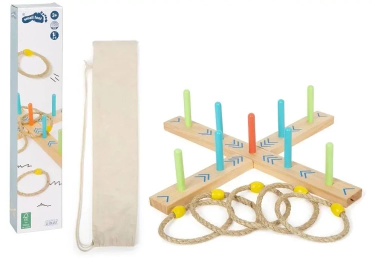 Zestaw składa się z drewnianego krzyżaka, 5 kolorowych słupków oraz 4 linowych pierścieni