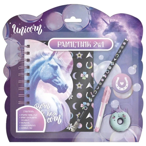 Ten fantastyczny zestaw składa się nie tylko z pamiętnika, ale również z różnorodnych przyborów. Zawiera wszystkie niezbędne narzędzia do kreatywnej zabawy i pisania. Zestaw stworzony z myślą o młodych fanach jednorożców, z pewnością zachwyci każde dziecko swoją estetyką oraz funkcjonalnością.