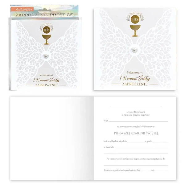 Zaproszenie Premium na Komunię ZP-053 Zaproszenia z serii Premium ZP wyróżniają się elegancją i wyjątkowym opakowaniem. Zdobienia w zależności od wzoru zawierają dekoracyjne elementy doklejane - perełki, kokardki, akcenty biżuteryjne; tłoczenia oraz przynajmniej dwie uszlachetnienia, takie jak folia perłowa lub holograficzna albo delikatny brokat. Zaproszenia pakowane są po 5 sztuk, mają w zestawie dopasowane koperty, a na specjalnej wkładce z tyłu można przeczytać tekst zaproszenia. Cechy szczególne: typ produktu: zaproszenie na Komunię zdobienia: doklejane elementy dekoracyjne, tłoczenie przestrzenne, przynajmniej dwa uszlachetnienia z folii lub brokatu, orientacyjna wielkość: 14,5 x 14,5 cm w opakowaniu: 5 sztuk zaproszeń z dopasowanymi kopertami, okazja: Komunia