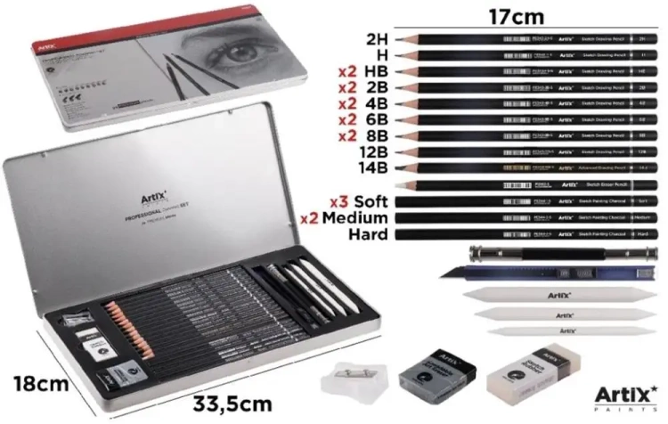Zestaw zawiera różnorodne narzędzia, które zostały starannie dobrane, aby sprostać wszystkim potrzebom artystycznym. Znajdziesz tu między innymi różnego rodzaju ołówki, węgle, kredki i wiele innych, które umożliwiają tworzenie precyzyjnych i zróżnicowanych rysunków. Dzięki temu, każdy twój szkic nabierze niepowtarzalnego charakteru.