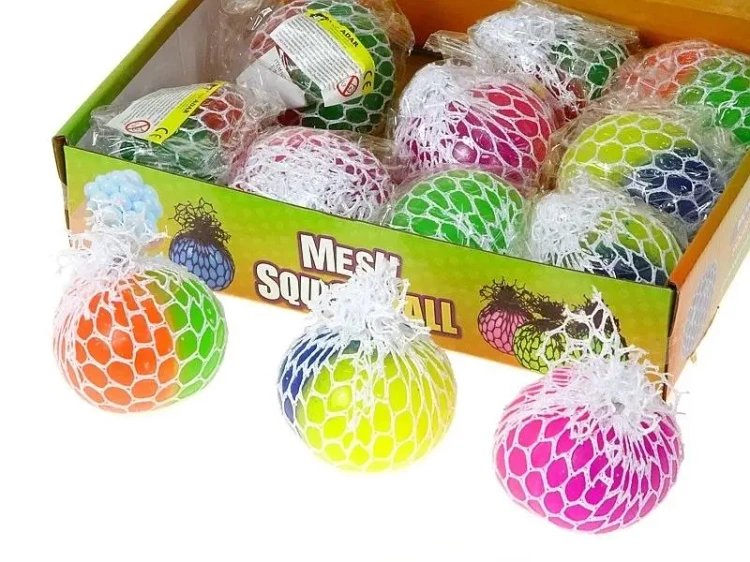 Gniotek żelowy w siatce o średnicy 6 cm, dostępny w opakowaniu zawierającym 12 sztuk. Całość jest zapakowana w funkcjonalne pudełko o wymiarach 25x20x5 cm. Produkt idealny do zabawy oraz jako antystresowy gadżet na każdą okazję.