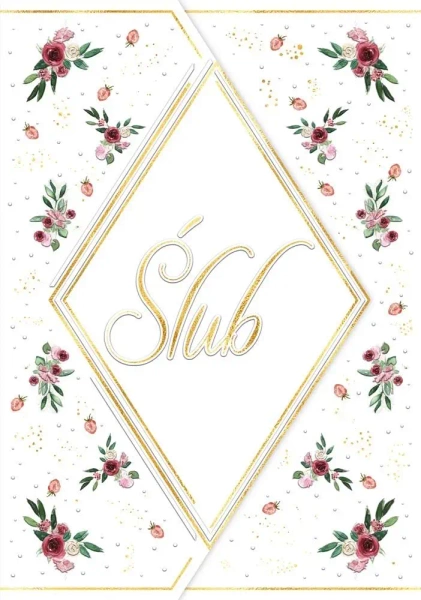 Ten elegancki karnet w formacie A5 został starannie złożony z trzech części, tworząc wyjątkową prezentację. Kartka jest bogato złocona i tłoczona, co nadaje jej luksusowy charakter. Wnętrze karnetu zawiera teksty życzeń, które dodadzą wyjątkowego uroku każdej okazji ślubnej. Produkt został wydrukowany na wysokiej jakości papierze, co gwarantuje jego trwałość i elegancję. Zestaw zawiera również kopertę, co czyni go kompletnym i gotowym do wręczenia.