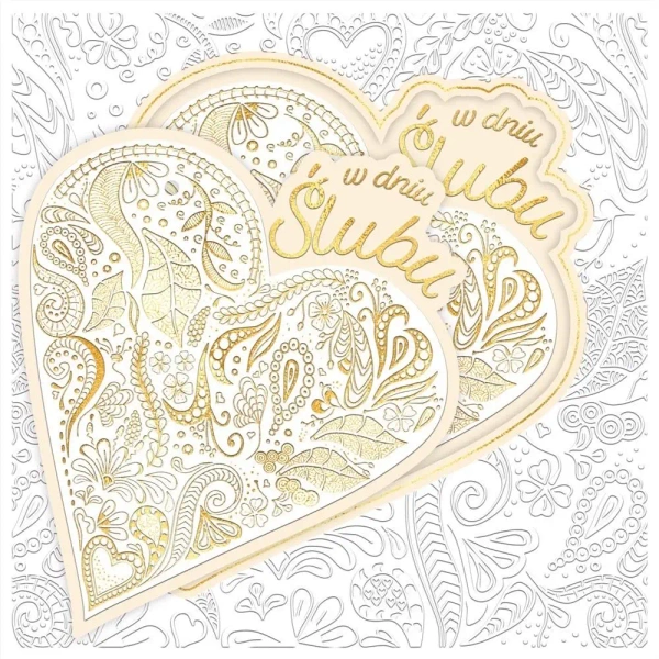 Oferujemy elegancki kwadratowy karnet ślubny o wymiarach 15 x 15 cm, który składa się z trzech stron. Na jego froncie znajduje się pięknie wycięty element, który dodaje wyjątkowego uroku. Karnet jest złocony i tłoczony, co podkreśla jego ekskluzywny charakter. Wewnątrz znajdują się starannie przygotowane życzenia, a całość została wydrukowana na papierze najwyższej jakości.