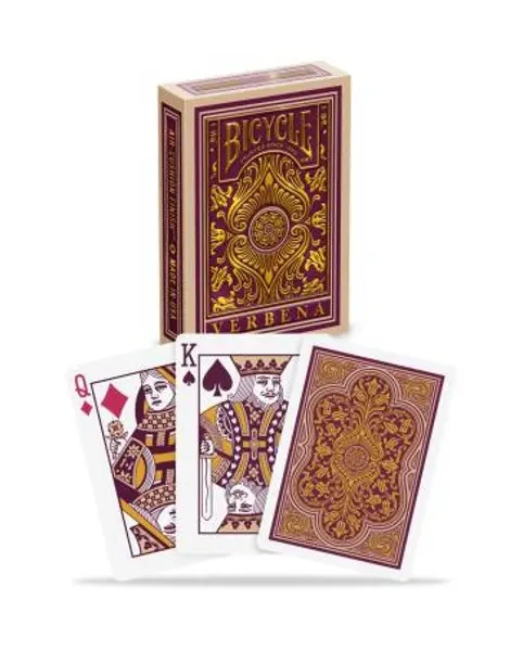 Karty Bicycle Verbena czerpią inspirację z uroku polnych kwiatów. Projekt rewersu zdobią zbiegające się w skomplikowane wzory linie łodyg oraz kwiatów. Dominującą jest głęboka fioletowa barwa, którą wzbogacają subtelne złote akcenty.