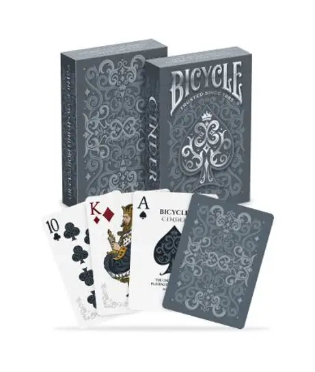 Bicycle Cinder to wyjątkowa talia kart czerpiąca inspirację z elegancji i enigmatyczności dymu unoszącego się z ogniska. Wzornictwo tej talii zachwyca różnorodnością odcieni popielatej szarości oraz błyszczącą srebrną folią ozdobioną dwupoziomowym tłoczeniem, które tworzy spektakularny efekt 3D. Karty posiadają także unikalną plombę zamykającą.