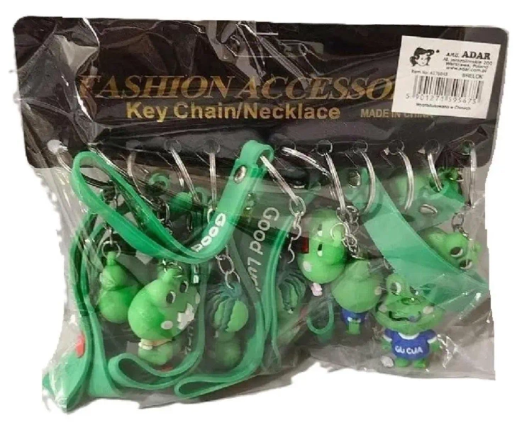 Oferujemy wyjątkowy brelok w kształcie żaby z uroczą przywieszką. Nasz produkt dostępny jest w zestawie składającym się z 12 sztuk na jednej karcie.