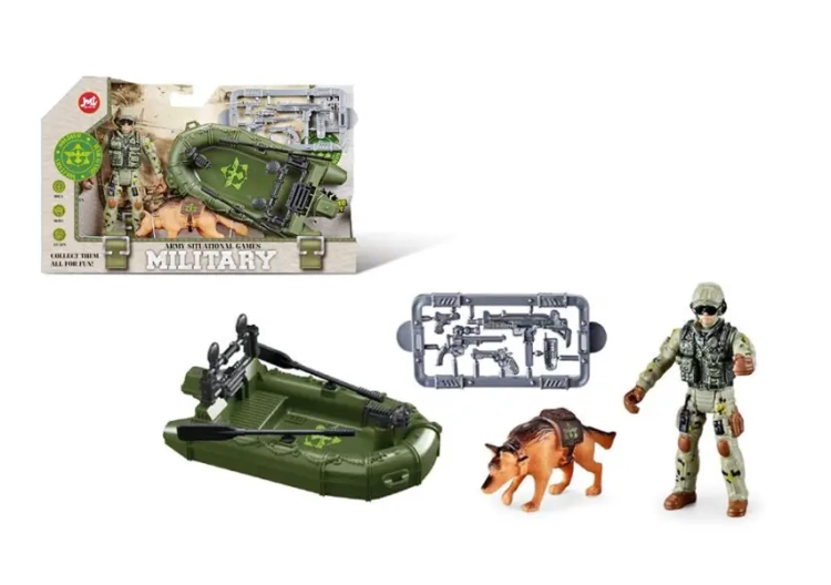 Zestaw wojskowy dla chłopców to niezwykle fascynująca zabawka, która dostarcza wiele radości. W skład kompletu wchodzą trzy elementy: ponton, figurka żołnierza oraz figurka psa. Produkt jest starannie zapakowany w kartonowe opakowanie z okienkiem, dzięki czemu od razu można zobaczyć jego atrakcyjną zawartość. Zabawka przeznaczona jest dla dzieci już od 3 roku życia, co czyni ją idealnym wyborem dla najmłodszych miłośników militariów. Podane wymiary dotyczą opakowania produktu.EAN: 5902496190638