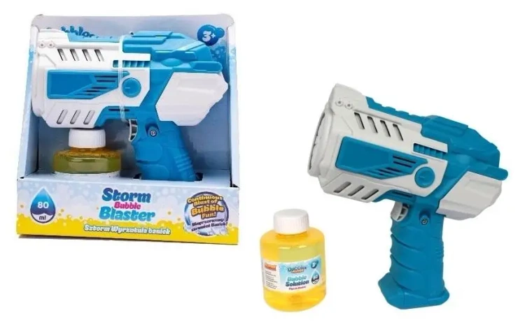Ta wyrzutnia baniek, utrzymana w niebieskiej kolorystyce, jest niezawodna i prosta w obsłudze. Wystarczy nacisnąć przycisk, aby rozpętać prawdziwy huragan baniek! Idealna na rodzinne imprezy i spotkania z przyjaciółmi.