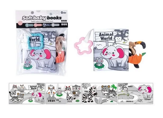 Mięciutka książeczka dla najmłodszych dzieci czarno biała. Posiada wystające elementy imitujące ogonki zwierząt. Książeczka posiada szeleszczące elementy. W jej wnętrzu są rysunki zwierząt i nazwy do każdego zwierzątka po angielsku. Zabawka zapakowana w przezroczysty worek. Produkt dla dzieci od pierwszych dni życia. Cena dotyczy jednej sztuki.