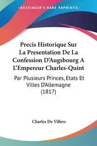 ""Pr�����cis historique sur la pr�����sentation de la Confession d'Augsbourg ������ l'Empereur Charles-Quint : par plusieurs princes, �����tats et villes d'Allemagne"" est un livre �����crit par Charles de Villers en 1817. Ce livre traite de la Confession d'Augsbourg, un document important de la R�����forme protestante, qui a �����t����� pr�����sent����� ������ l'Empereur Charles-Quint en 1530 par plusieurs princes, �����tats et villes d'Allemagne. Le livre explore les circonstances entourant la pr�����sentation de la Confession d'Augsbourg, ainsi que son impact sur la R�����forme protestante et l'histoire de l'Allemagne. Il s'agit d'une lecture essentielle pour ceux qui s'int�����ressent ������ l'histoire de la R�����forme protestante et de l'Allemagne au XVIe si�����cle.""This Book Is In French.This scarce antiquarian book is a facsimile reprint of the old original and may contain some imperfections such as library marks and notations. Because we believe this work is culturally important, we have made it available as part of our commitment for protecting, preserving, and promoting the world's literature in affordable, high quality, modern editions, that are true to their original work.