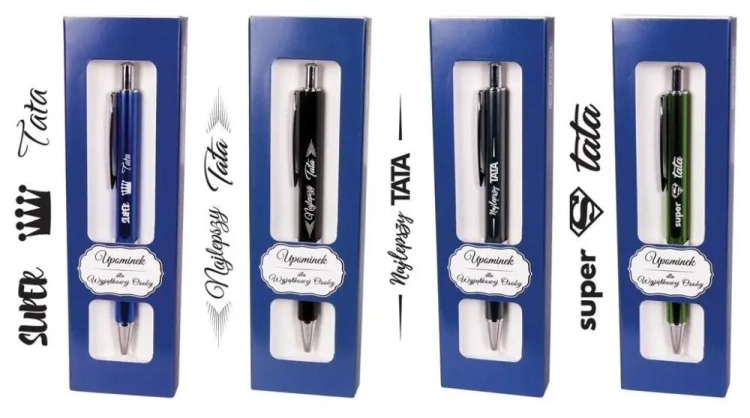 Metalowy, automatyczny długopis CARLOS z nadrukiem stanowi doskonały prezent na różne okazje dla TATY. Jest zapakowany w eleganckie etui prezentowe. Dostępny jest w różnych kolorach z różnymi wzorami nadruku. Wkład niebieski można wymieniać.