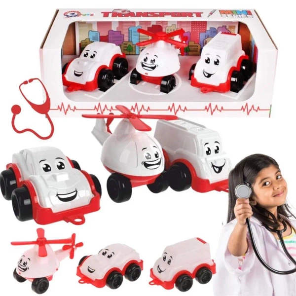Urocze buźki: zabawki, takie jak helikopter, karetka i samochód, zostały wyposażone w wyraziste oczy i uśmiechy, co nadaje im przyjazny i sympatyczny wygląd. To sprawia, że dzieci mogą utożsamiać się z zabawkowymi bohaterami, co rozwija empatię u maluchów.