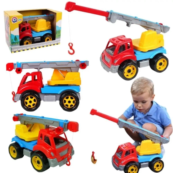 Dźwig posiada ruchomy wysięgnik, który obraca się na boki oraz wysuwa się w górę, co pozwala symulować pracę prawdziwego dźwigu. Dziecko może korzystać ze specjalnej korbki, aby regulować wysokość haku. Ta funkcjonalność nie tylko dodaje realizmu, ale również rozwija manualne umiejętności i uczy obsługi mechanicznych elementów. Dodatkową atrakcją jest możliwość obracania dźwigu o 360 stopni.