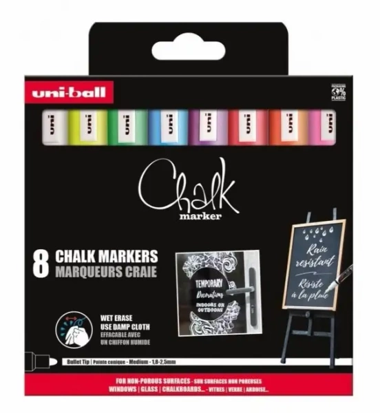 Prezentujemy zestaw markerów kredowych Chalk PWE-5M, w skład którego wchodzi 8 sztuk w różnych kolorach: biały, fioletowy, czerwony, jasno-niebieski, fluo żółty, fluo zielony, fluo pomarańczowy oraz fluo różowy.