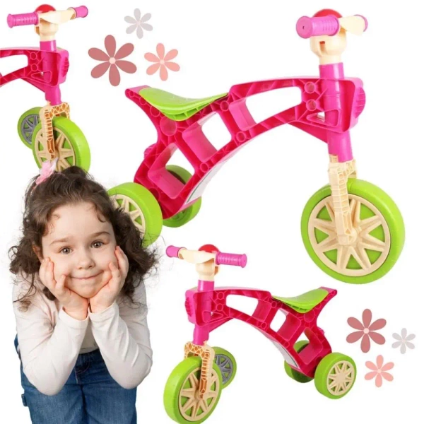 Rowerek trójkołowy łączy w sobie funkcję rowerka biegowego, hulajnogi i jeździka do pchania. Maluch ma okazję eksperymentować z różnymi formami jazdy i odkrywać nowe sposoby poruszania się.