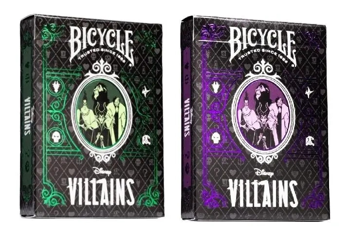 Nasz zestaw kart do gry z serii Disney Villains ukazuje czterech znanych złoczyńców Disneya na frontowych stronach, przyozdobionych srebrnymi oraz zielonymi lub fioletowymi akcentami foliowymi na opakowaniu.