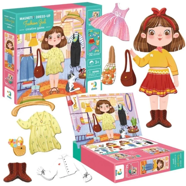 W skład zestawu wchodzi magnetyczna tablica oraz 32 magnesy z różnorodnymi elementami garderoby. Dzięki nim mali projektanci mogą tworzyć własne, niepowtarzalne stylizacje, łącząc i dopasowując różne ubrania oraz akcesoria.