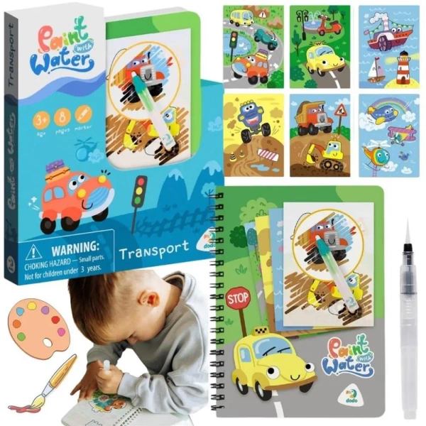 W skład zestawu wchodzi kolorowanka z motywem środków transportu - łącznie 8 stron do pokolorowania. Jednak to nie wszystko! Oryginalność tego zestawu polega na wykorzystaniu markera wodnego. Po zdjęciu osłony z markera i napełnieniu go wodą, maluch może zacząć tworzyć swoje arcydzieła na stronach kolorowanki. Fascynujące jest to, że po chwili obraz znika, co umożliwia maluchowi tworzenie kolejnych malarskich dzieł bez końca.