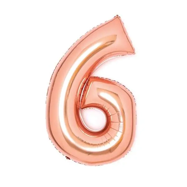 Piękny balon foliowy w kształcie cyfry 6, wykończony w eleganckim kolorze różowego złota, to doskonała dekoracja na każdą okazję. Wymiary balonu wynoszą 46 cm x 66 cm, co sprawia, że jest idealny na urodziny, rocznice oraz inne wyjątkowe wydarzenia.