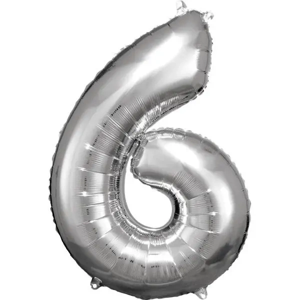 W naszej ofercie znajduje się balon foliowy w kształcie cyfry 6 w eleganckim, srebrnym kolorze.