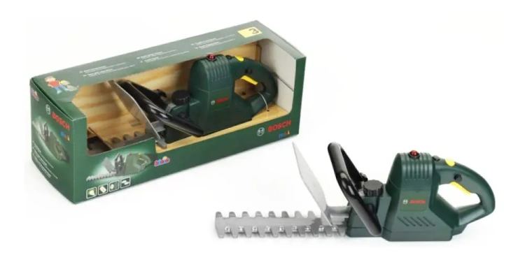 Nożyce żywopłotowe marki Klein pochodzą z serii zabawek Bosch mini powstałej na licencji firmy Bosch, dlatego też są kopią faktycznie istniejącego narzędzia tej marki. Nożyce są w kolorze ciemnej zieleni z czarnymi i żółtymi dodatkami i srebrnym ostrzem nożyc, opatrzone także charakterystycznym czerwonym logo Bosch. Zabawka podczas pracy oprócz ruchu plastikowego łańcuszka umieszczonego w transparentnej obudowie wewnątrz ostrza nożyc, wydaje także dźwięk przypominający pracę silnika, a także dodatkowo efekt świetlny w postaci czerwonej diody sygnalizującej włączenie urządzenia. Ponadto na obudowie nożyc do żywopłotu są dwa pokrętła, żółte i czarne, które podczas przekręcania wydają mechaniczny terkoczący odgłos. Wszystkie elementy zestawu są wykonane z plastiku, pozbawione ostrych krawędzi i całkowicie bezpieczne dla dziecka. Bawiąc się nożycami żywopłotowymi dzieci już od najmłodszych lat w bezpieczny sposób będą mogły wcielić się w rolę majsterkowicza, zapewniając sobie realistyczne doświadczenie korzystania z narzędzia. Zabawka umożliwia maluchom kreatywną zabawę i doskonalenie umiejętności manualnych. Dzieci uwielbiają naśladować rodziców wykonujących codzienne czynności domowe lub w nich uczestniczyć, jednak nie zawsze jest to możliwe ze względów bezpieczeństwa, a dzięki tym całkowicie bezpiecznym dla dzieci, zabawkowym nożycom każdy mały majsterkowicz może bezpiecznie robić to, co jego opiekunowie. Zabawka wymaga użycia baterii, które nie są zawarte w zestawie.