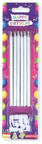 Spraw, aby każde urodziny były wyjątkowe dzięki srebrnym świeczkom urodzinowym dostępnym w zestawie 12 sztuk. Te stylowe i eleganckie świeczki doskonale wpasują się w dekoracje każdego przyjęcia urodzinowego, dodając blasku i szyku każdemu tortowi.