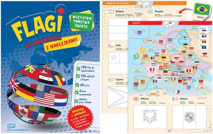 Ta edukacyjna kolorowanka w przyjazny sposób pomaga poszerzać wiedzę dzieci na temat otaczającego ich świata. Na 40 dużych stronach (240 x 322 mm) znajdują się flagi wszystkich państw, czyli 193 państw członkowskich ONZ oraz Watykanu, Palestyny i Kosowa. Dodatkowo na rozkładówce jest 196 naklejek z flagami. Naklejki te należy wkleić w odpowiednich miejscach na stronach, gdzie będą służyć jako wzorzec do kolorowania. Państwa zostały przyporządkowane do 6 kontynentów: Europy, Azji, Australii i Oceanii, Afryki, Ameryki Północnej oraz Ameryki Południowej. Dzięki zawartym mapom dzieci mogą także dowiedzieć się, gdzie znajdują się poszczególne kraje. Dodatkowo obok flagi każdego kraju są skrótowe informacje: nazwa stolicy, kontynent, na którym leży dany kraj, liczba ludności, powierzchnia oraz język urzędowy.
