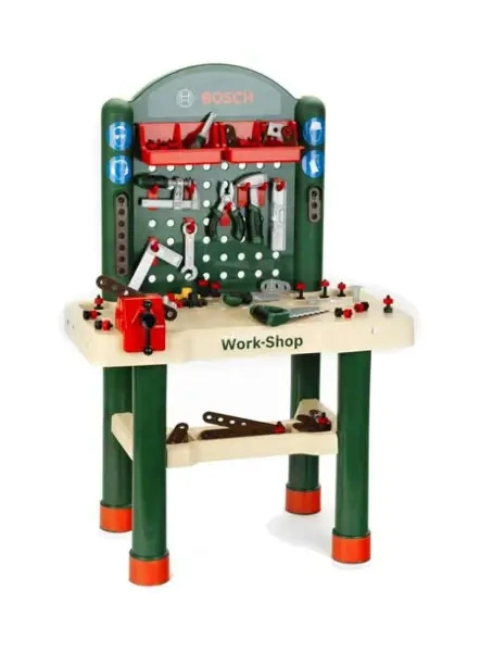 Warsztat marki Klein pochodzi z serii zabawek Bosch mini powstałej na licencji firmy Bosch, dlatego też narzędzia wchodzące w jego skład są wiernymi kopiami faktycznie istniejących narzędzi tej marki. W zestawie zapakowanym w duży zielony karton Klein, znajdziemy aż 82 elementy konstrukcyjne i narzędzia do zabawy. Głównym elementem tego zestawu jest z pewnością kremowo-zielony stół warsztatowy ze ścianą z haczykami i czerwonymi półkami na narzędzia. Ten warsztat zapewnia wyjątkowo dużo miejsca do zabawy, ponieważ blat ma aż 68 cm szerokości. Dodatkowo znajdują się w nim otwory do wbijania dołączonych (plastikowych) gwoździ i wkręcania śrub. Narzędzia będące częścią tego warsztatu to czerwone imadło, młotek, kombinerki, piła, pilnik, śrubokręt i ścisk stolarski. Zabawki te mają ciemno-zielone rączki, a ich wygodny uchwyt ma dodatkowo czarną profilowaną powierzchnię z logo Klein ułatwiającą utrzymanie narzędzia w dziecięcych dłoniach. Dodatkowo przy warsztacie znajdziemy jeszcze srebrny klucz płaski, poziomicę i kątownik, a także wiele innych drobnych elementów, jak śrubki, nakrętki, czy inne części konstrukcyjne do kreatywnej zabawy. Wszystkie elementy zestawu są wykonane z plastiku, pozbawione ostrych krawędzi i całkowicie bezpieczne dla dziecka. Zestaw został stworzony z dbałością o szczegóły i detale z wysokiej jakość materiałów, przez co wiernie naśladuje prawdziwe narzędzia i będzie służyć dzieciom przez długi czas. Dzięki warsztatowi dzieci w bezpieczny sposób będą mogły wcielić się w rolę majsterkowicza, zapewniając sobie realistyczne doświadczenie korzystania z wszystkich jego narzędzi. Dzieci uwielbiają naśladować rodziców wykonujących codzienne czynności domowe lub w nich uczestniczyć, jednak nie zawsze jest to możliwe ze względów bezpieczeństwa, a dzięki temu całkowicie bezpiecznemu dla dzieci, zabawkowemu warsztatowi z narzędziami każdy mały majsterkowicz może bezpiecznie robić to, co jego opiekunowie.