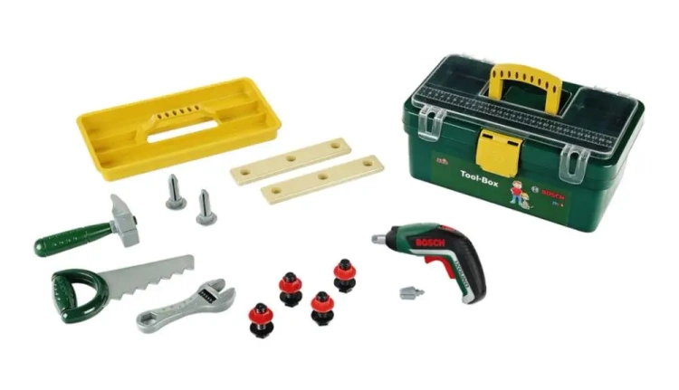 Skrzynka z narzędziami i wkrętarką Klein powstała na licencji Bosch, dlatego też są wierną kopią prawdziwego urządzenia produkowanego przez tę firmę. Skrzynka ma kolor ciemnej zieleni, żółtą rączką oraz otwierane przezroczyste wieczko, dzięki któremu dziecko z łatwością może sprawdzić co jest wewnątrz, bez konieczności jej otwierania. Wewnątrz znajduje się żółta tacka z rączką, która ułatwia zabawę w majsterkowanie, gdyż można na niej położyć drobne elementy, takie jak śruby z zestawu. W komplecie jest dodatkowo piła i młotek z ciemno-zielonymi rączkami, klucz francuski oraz bezprzewodowa wkrętarka Bosch Ixiolino II. Wkrętarka jest solidnie wykonana z dużą dbałością o szczegóły, ma dwie wymienne końcówki śrubokręta, przez co wiernie naśladuje prawdziwe urządzenie. Zabawka jak prawdziwa ma wygodny uchwyt z gumową powierzchnią ułatwiającą utrzymanie zabawki w dziecięcych dłoniach, ma możliwość przełączenia za pomocą czerwonego przesuwaka obrotu końcówki w prawo i w lewo, a także diodę podświetlającą miejsce wkręcania, zamieszczoną nad bitem. Ponadto w skrzynce są jeszcze dwie plastikowe deseczki z otworami do wkręcania śrub, dwa bity oraz cztery czarne śruby z czerwonymi nakrętkami. Wszystkie narzędzia są wykonane z plastiku i bezpieczne dla dziecka. Skrzynka z narzędziami Bosch to wspaniała zabawka dla każdego małego majsterkowicza, która zapewni długie godziny świetnej zabawy. Dzięki tej zabawce dzieci w bezpieczny sposób będą mogły wcielić się w rolę majsterkowicza, zapewniając sobie realistyczne doświadczenie korzystania z wkrętarki i pozostałych narzędzi ze skrzynki. Dzieci uwielbiają naśladować rodziców wykonujących codzienne czynności domowe lub w nich uczestniczyć, jednak nie zawsze jest to możliwe ze względów bezpieczeństwa. Dzięki tej całkowicie bezpiecznej dla dzieci, zabawkowej skrzynce każdy mały majsterkowicz może robić to, co jego opiekunowie. Zabawka wymaga użycia baterii, które nie są zawarte w zestawie.