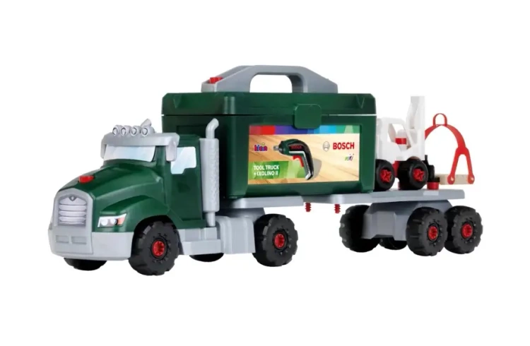 Ciężarówka pochodzi z serii zabawek Bosch mini powstałej na licencji firmy Bosch, dlatego też narzędzia wchodzące w jego skład są wiernymi kopiami faktycznie istniejących narzędzi tej marki. Ciężarówka zapewni mnóstwo świetnej zabawy. Pojazd może składać i rozmontowywać do woli, a wszystko to dzięki dołączonej do zestawu zabawkowej wkrętarce Ixolino II. Wkrętarka wymaga użycia baterii, które nie są częścią zestawu. Zestaw składa się z 86 części i umożliwia stworzenie wielu pojazdów, dzięki czemu zabawa nie będzie miała końca. Pojazd ciężarowy wyposażony został w zdejmowaną skrzynkę na narzędzia, więc dojazd do miejsca, gdzie potrzebna jest naprawa będzie niezwykle prosty. Duża ciężarówka od firmy Klein to świetny pomysł na prezent dla chłopców, którzy lubią zabawę w majsterkowanie. Pojazd ma aż 47 centymetrów długości z możliwością rozbudowy, aż do 70 centymetrów. Samochód ma kompletnie załadowaną skrzynię narzędziową, w której znajduje się wszystko, co jest niezbędne do dobrej zabawy. Zawarte w zestawie narzędzia pozwolą maluchom zmienić tą ciężarówkę w duży transporter, który może pomieścić dźwig, wózek widłowy i paletę. Zabawka wykonana jest z wysokiej jakości tworzywa sztucznego, dzięki czemu jest w pełni bezpieczna dla najmłodszych dzieci. Dbałość o szczegóły i solidne wykonanie auta sprawią, że będzie ono dzieciom służyć przez długi czas. Podczas zabawy dzieci rozwijają kreatywność a także ćwiczą zręczność i motorykę.