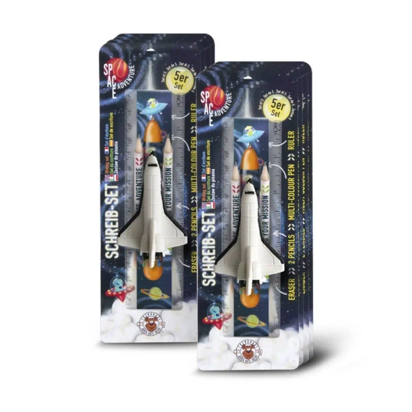 Odkryj nowy wymiar pisania z naszym 5-częściowym zestawem, który sprawi, że codzienne obowiązki szkolne staną się przyjemniejsze i bardziej kolorowe. Zestaw zawiera linijkę o długości 15 cm/6 cali, 2 ołówki z nadrukiem i wkładem HB, wyjątkowy wielokolorowy ołówek z kosmicznym motywem, który oferuje 4 kolory oraz praktyczną gumkę do ścierania.