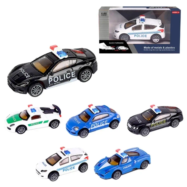Ten metalowy samochód policyjny wykonano w skali 1:55. Jest wyposażony w napęd typu pull-back, który pozwala na szybkie i efektowne uruchomienie. Produkt dostępny jest w 6 różnych wzorach, co dodaje element niespodzianki dla każdego kupującego.