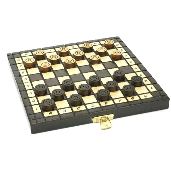 Odkryj klasyczną grę warcaby w eleganckiej, drewnianej kasetce o wymiarach 20 cm. Doskonałe zarówno dla młodszych, jak i starszych miłośników gier planszowych, zapewni zabawę na wiele godzin. Ta pięknie wykonana wersja warcabów jest idealna jako prezent lub dodatek do Twojej kolekcji gier.