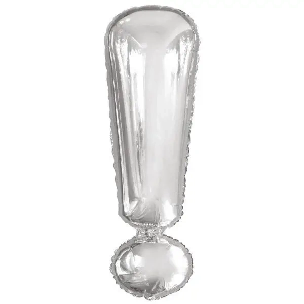 Oferujemy balon foliowy w kształcie znaku wykrzyknika, utrzymany w eleganckim srebrnym kolorze.