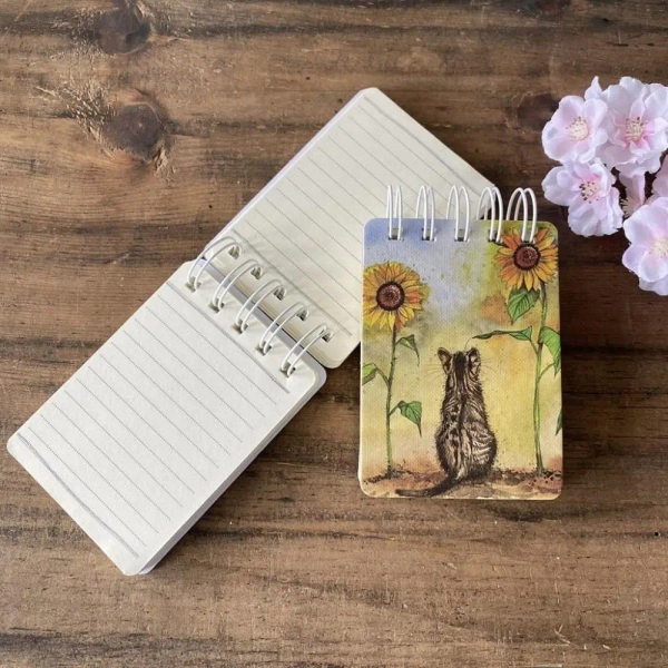 Zapraszamy do odkrycia eleganckiego kołonotatnika w kompaktowym formacie A7. Wyróżnia się on twardą okładką z uroczym motywem kota i słoneczników autorstwa Alex Clark. Praktyczne otwieranie do góry zapewnia wygodę użycia w każdej sytuacji.