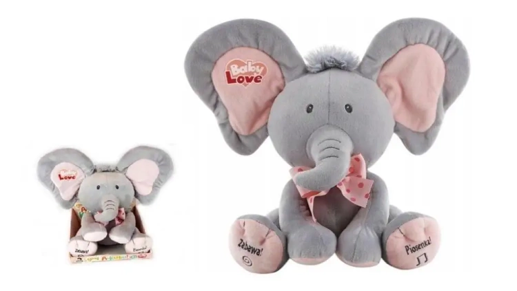 Odkryj uroczy, szaro-różowy pluszowy Słonik "A Kuku" o wysokości 24 cm. Ta interaktywna zabawka mówi i śpiewa w języku polskim, oferując wiele radości dla najmłodszych.