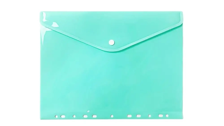 Przedstawiamy teczkę kopertową, wykonaną z trwałej folii PP w delikatnym, pastelowo-zielonym odcieniu. Brzegi są zgrzane, co zapewnia wytrzymałość i estetyczny wygląd. Produkt jest zamykany na wygodny nap, który skutecznie chroni zawartość przed przypadkowym wypadnięciem.