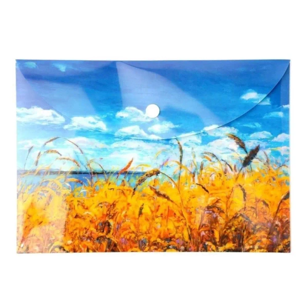 Prezentujemy teczkę kopertową VISTA w formacie A5, wyróżniającą się ozdobnym wzorem przedstawiającym impresjonistyczny pejzaż - kołyszące się zboża na tle błękitnego nieba. Produkt został stworzony z wytrzymałego polipropylenu, co gwarantuje jego długotrwałość. Zamknięcie na zatrzask typu napa zapewnia bezpieczeństwo przechowywanych dokumentów oraz innych małych, płaskich przedmiotów. Dzięki pełnemu zadrukowi, zawartość pozostaje niewidoczna z zewnątrz, co dodatkowo podnosi poziom prywatności.