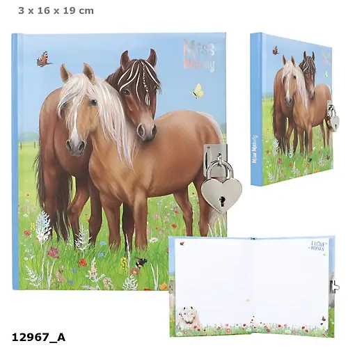 Przedstawiamy wyjątkowy pamiętnik Miss Melody, wyposażony w uroczy zamek w kształcie serca. Jego obudowa zdobią czarujące motywy koni, umieszczone na barwnej, kwiecistej łące - zarówno z przodu, jak i z tyłu.