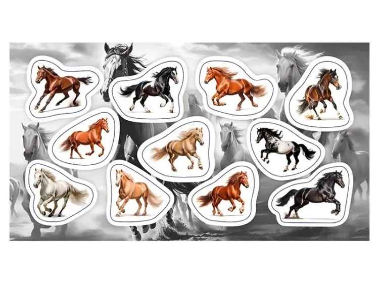 W skład zestawu wchodzi 11 naklejek przedstawiających przepiękne konie różnych maści. Efektowne przedstawienia koni w galopie z pewnością zachwycą każdego miłośnika tych majestatycznych zwierząt.
