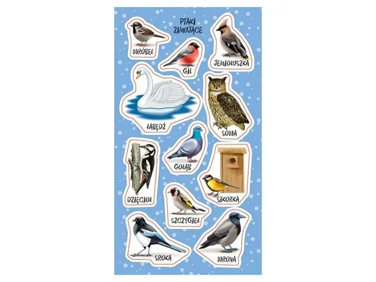 Zestaw składa się z 11 wyjątkowych naklejek przedstawiających różnorodne ptaki, które można spotkać zimą w Polsce. Każda naklejka zawiera krótki opis, który pozwala lepiej poznać te fascynujące stworzenia.