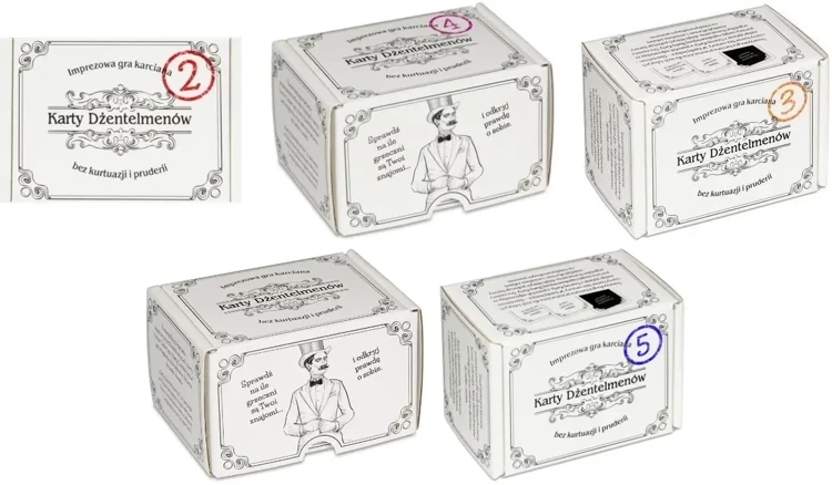 Karty Dżentelmenów to imprezowa gra towarzyska bez kurtuazji i pruderii, za to z ogromną dawką czarnego humoru. Dżentelmeńskie rozgrywki z pewnością urozmaicą każde spotkanie w gronie błyskotliwych i obdarzonych niebywałym poczuciem humoru osób. Nie powinno jej zabraknąć na Twojej imprezie! Produkt posiada przejrzyste zasady, co zachęci każdego do gry i pozwoli szybko wczuć się w atmosferę pełną czarnego humoru. Grą kieruje prosta mechanika: w każdej kolejce Dżentelmen zadaje pytanie z Czarnej Karty, a pozostali odpowiadają za pomocą swojej najzabawniejszej Białej Karty. Drugim sposobem wykorzystania gry Karty Dżentelmenów jest tworzenie z jej pomocą opowieści pełnych czarnego humoru bez cenzury. Podczas gry w Dżentelmeńskie Opowieści wszyscy gracze wspólnie tworzą absurdalne i wciągające historie w oparciu o frazy z Białych Kart. Pozwólcie się zaskoczyć efektami Waszej kreatywności! Gra Karty Dżentelmenów dzięki eleganckiej oprawie nadaje się na wyszukany i na pewno trafiony prezent. Jako jedyna na polskim rynku gra karciana zawiera anglojęzyczne odpowiedniki pytań i odpowiedzi, dzięki którym pokonuje bariery międzykulturowe i umożliwia zabawę na międzynarodowym poziomie.