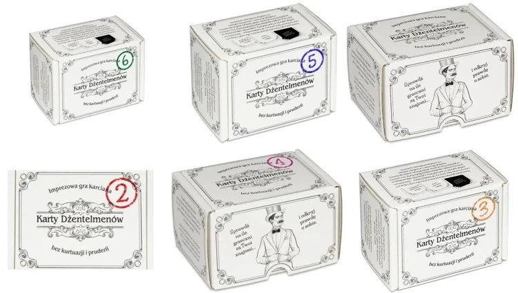 Karty Dżentelmenów to imprezowa gra towarzyska bez kurtuazji i pruderii, za to z ogromną dawką czarnego humoru. Dżentelmeńskie rozgrywki z pewnością urozmaicą każde spotkanie w gronie błyskotliwych i obdarzonych niebywałym poczuciem humoru osób. Nie powinno jej zabraknąć na Twojej imprezie! Produkt posiada przejrzyste zasady, co zachęci każdego do gry i pozwoli szybko wczuć się w atmosferę pełną czarnego humoru. Grą kieruje prosta mechanika: w każdej kolejce Dżentelmen zadaje pytanie z Czarnej Karty, a pozostali odpowiadają za pomocą swojej najzabawniejszej Białej Karty. Drugim sposobem wykorzystania gry Karty Dżentelmenów jest tworzenie z jej pomocą opowieści pełnych czarnego humoru bez cenzury. Podczas gry w Dżentelmeńskie Opowieści wszyscy gracze wspólnie tworzą absurdalne i wciągające historie w oparciu o frazy z Białych Kart. Pozwólcie się zaskoczyć efektami Waszej kreatywności! Gra Karty Dżentelmenów dzięki eleganckiej oprawie nadaje się na wyszukany i na pewno trafiony prezent. Jako jedyna na polskim rynku gra karciana zawiera anglojęzyczne odpowiedniki pytań i odpowiedzi, dzięki którym pokonuje bariery międzykulturowe i umożliwia zabawę na międzynarodowym poziomie.