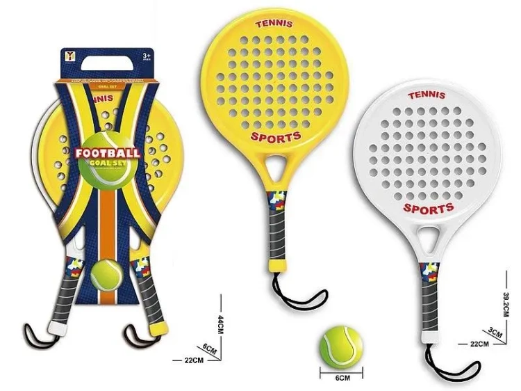 Ten zestaw do gry w tenisa zawiera dwie rakiety i piłkę, co sprawia, że jest idealny zarówno dla początkujących, jak i zaawansowanych graczy. Znajduje się w opakowaniu o wymiarach 44x22x6 cm.