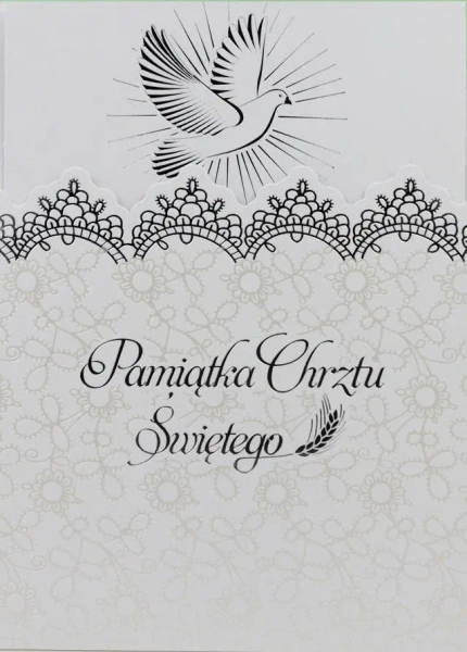 Okolicznościowa kartka na Chrzest Święty z eleganckimi życzeniami. Produkt wyróżnia zastosowanie uszlachetnień, które różnią się w zależności od wybranego projektu graficznego. Można tu znaleźć folie w kolorze złotym, srebrnym lub multikolor-holografik, a także elementy 3D, cekiny bądź cyrkonie. Stosowana metoda hotstampingu dodaje kartce metalicznego połysku.