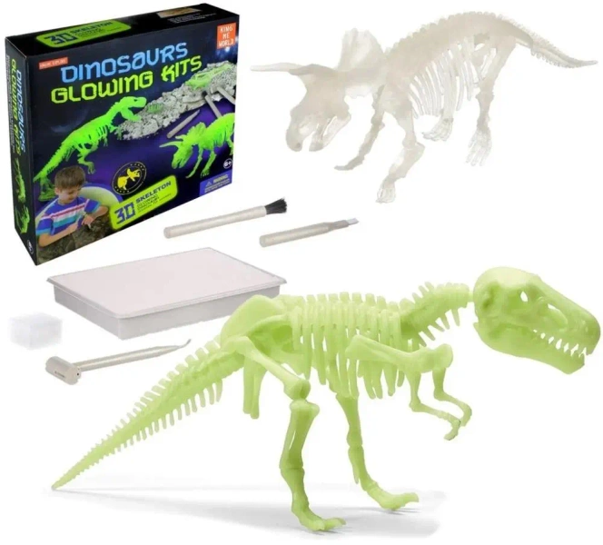 Zestaw ten obejmuje odlew gipsowy, z którego przy użyciu narzędzi dzieci mogą wydobyć szkielet dinozaura. Co więcej, szkielet ten świeci w ciemności, co dodaje mu niesamowitego efektu. Wspaniała zabawa pozwalająca najmłodszym poczuć się jak prawdziwi paleontolodzy.