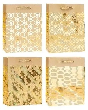 Elegancka torebka ozdobna wykonana z brokatowego materiału o gramaturze 210 gsm, pakowana po 12 sztuk. Zawiera cztery różne wzory, reprezentowane przez kod TG-23055-HS-A4.