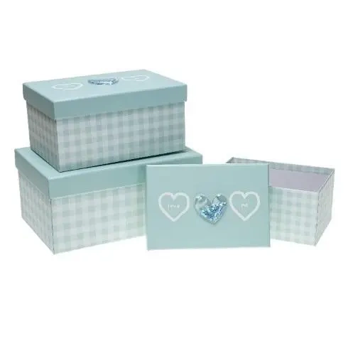 Oferujemy zestaw trzech zielonych, prostokątnych pudełek, idealnych na prezent. Każde pudełko różni się nieco rozmiarem, co umożliwia dopasowanie do różnych przedmiotów.