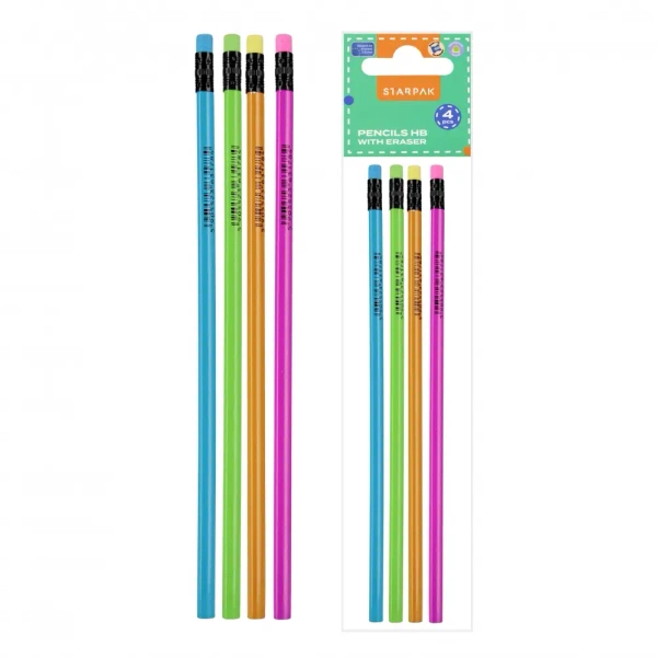 Zestaw ołówków trójkątnych z kolekcji STARPAK oferuje 4 sztuki z wbudowaną gumką, które charakteryzują się odpornością na łamanie się podczas strugania. Produkt nie pozostawia śladów oraz jest wykonany z solidnego drewna, co zapewnia zarówno komfort, jak i trwałość. Ołówki posiadają uniwersalną twardość HB, idealną do pisania, rysowania oraz nauki matematyki.Cechy szczególne