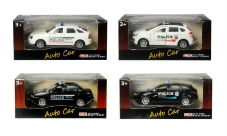 Policyjny samochód wykonany z plastiku i metalu. Wyposażony w otwierane przednie drzwi, co dodaje realności i zwiększa frajdę podczas zabawy. Auto porusza się dzięki mechanizmowi napędu pull back, co sprawia, że jest gotowe do natychmiastowej akcji. Idealnie sprawdzi się w różnych scenariuszach policyjnych pościgów.Różnorodność Kolorystyczna